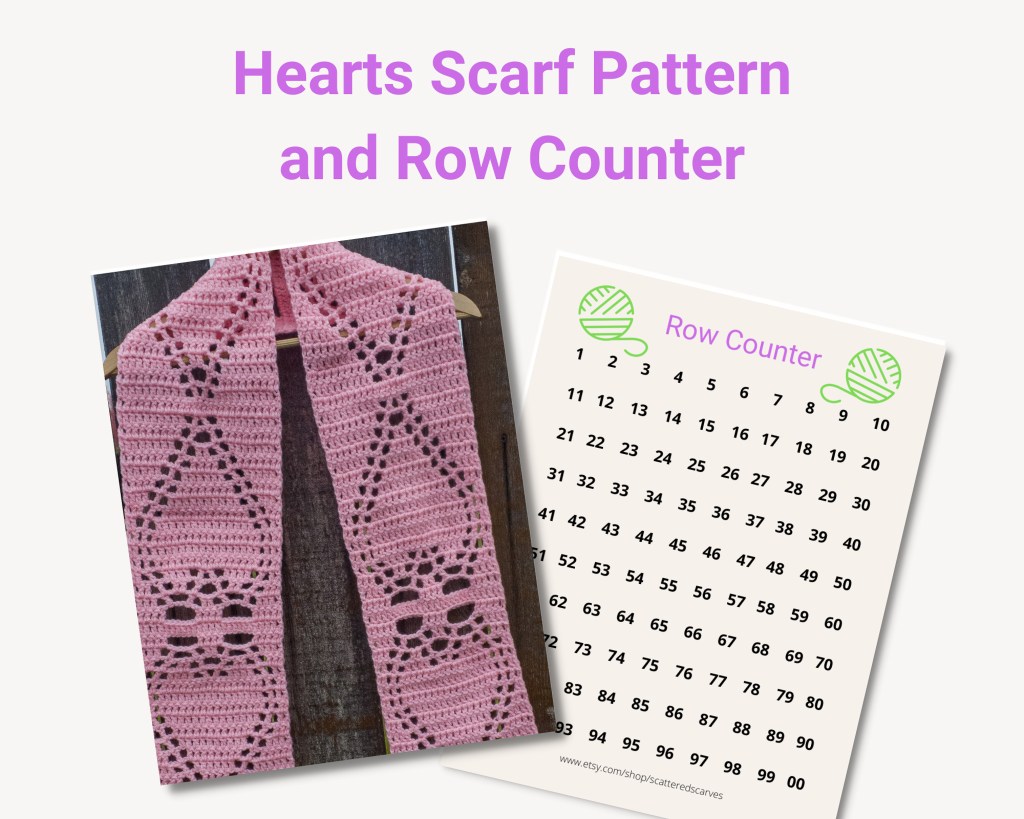 This cute Hearts Scarf Crochet Pattern comes with a printable row tracker and is in my Etsy shop Scattered Scarves.