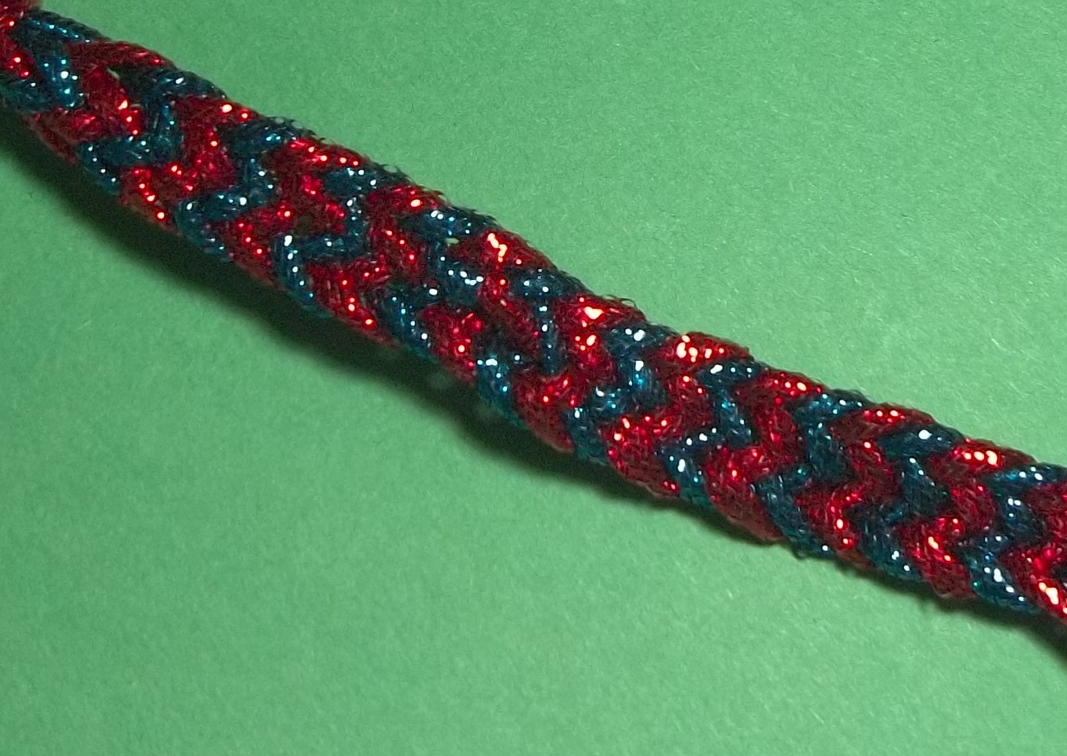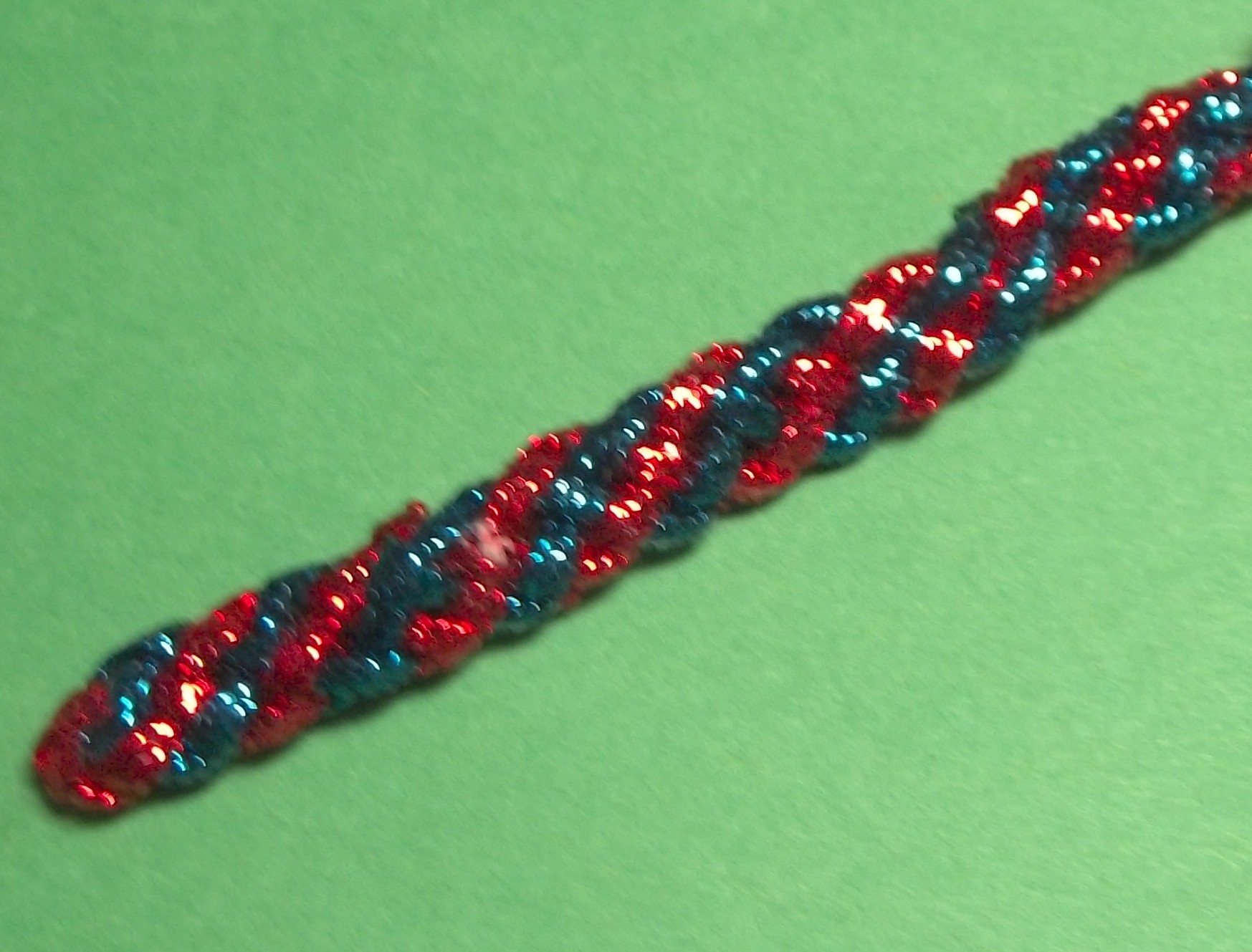 Braid 16.1 10/14/2016Karen Braids 2 Comments This is a fuzzy picture of an 8 strand flat braid. It’s hard to get good pics of something that is shiny. The reverse side of this one is different.