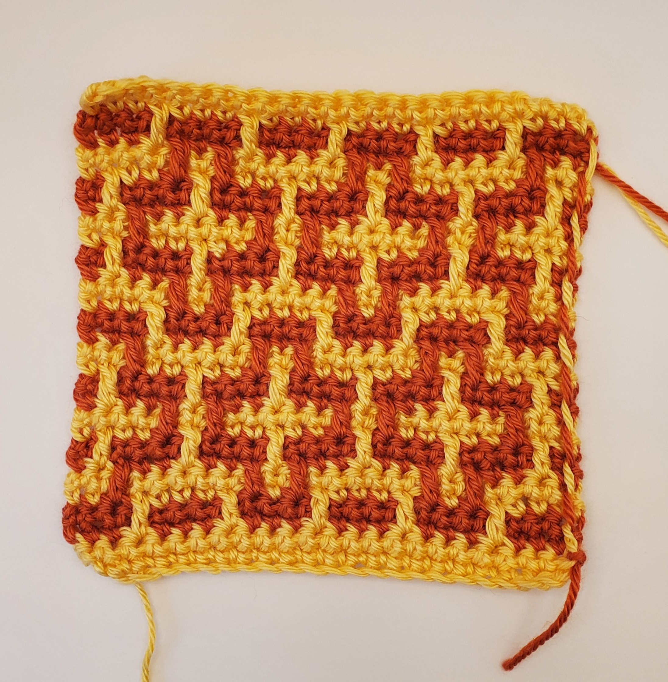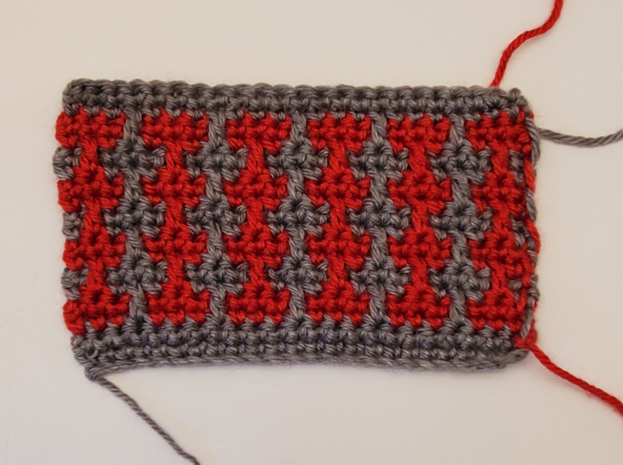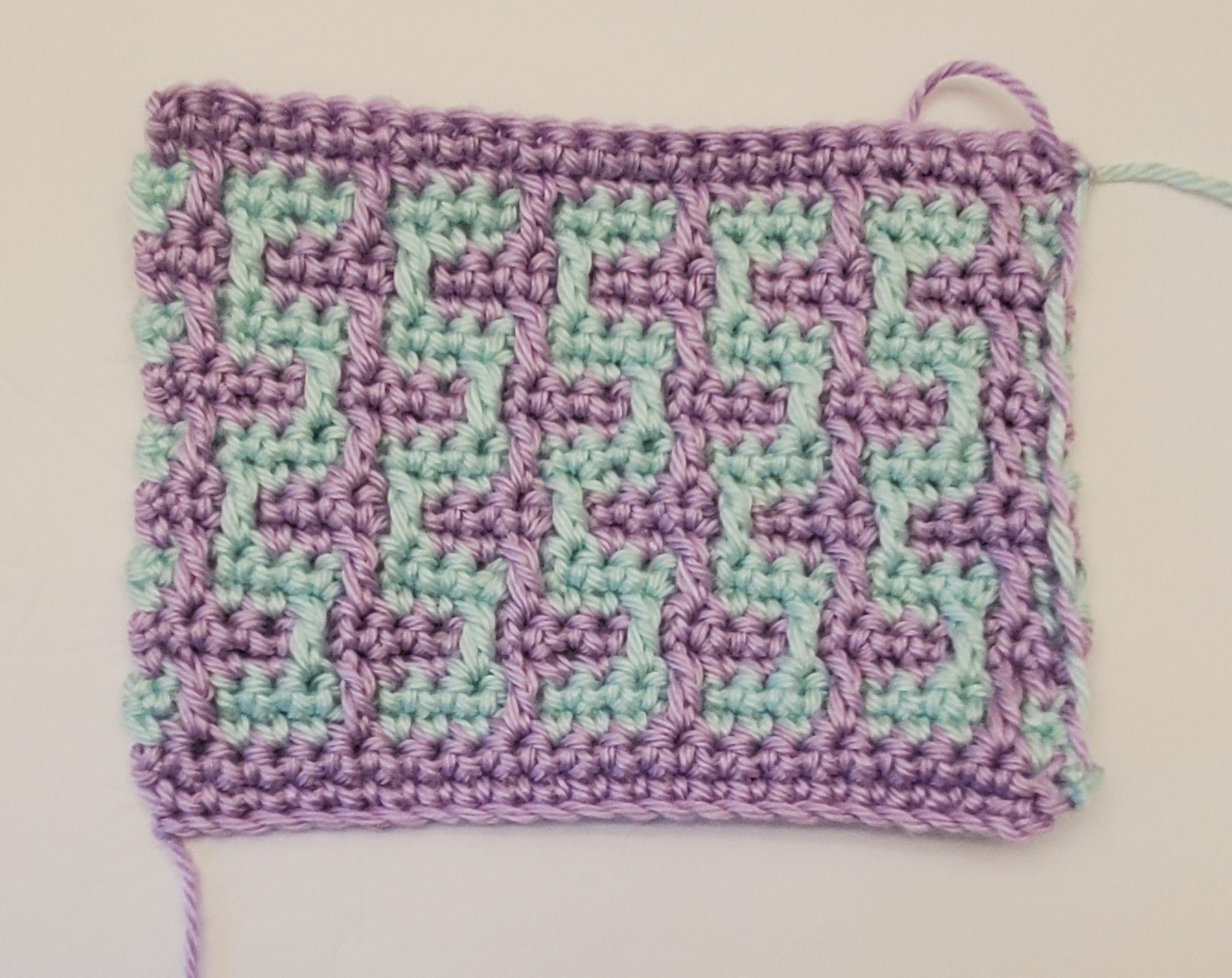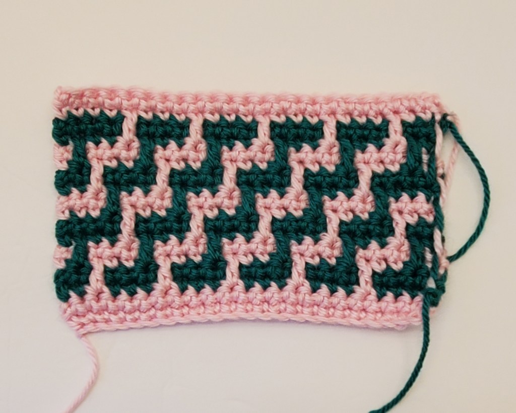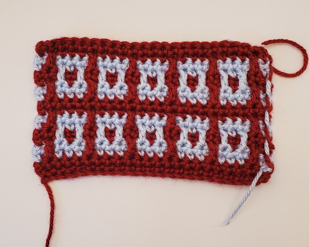 I got this pattern from an online book called “Learn to Crochet Mosaic Hats”, by Melissa Leapman. I just made a sample of the design, not the whole hat. I will do this with all the designs. There were no maps, or charts, for this, I had to make my own. If you want, I can include that here, and in later posts. Just let me know. The directions for this hat were confusing. It starts with how to do the pattern, which is built on 4 foundations rows. The directions for the foundation rows are later in the pattern. That’s just silly. And confusing. But, I do like the pattern.