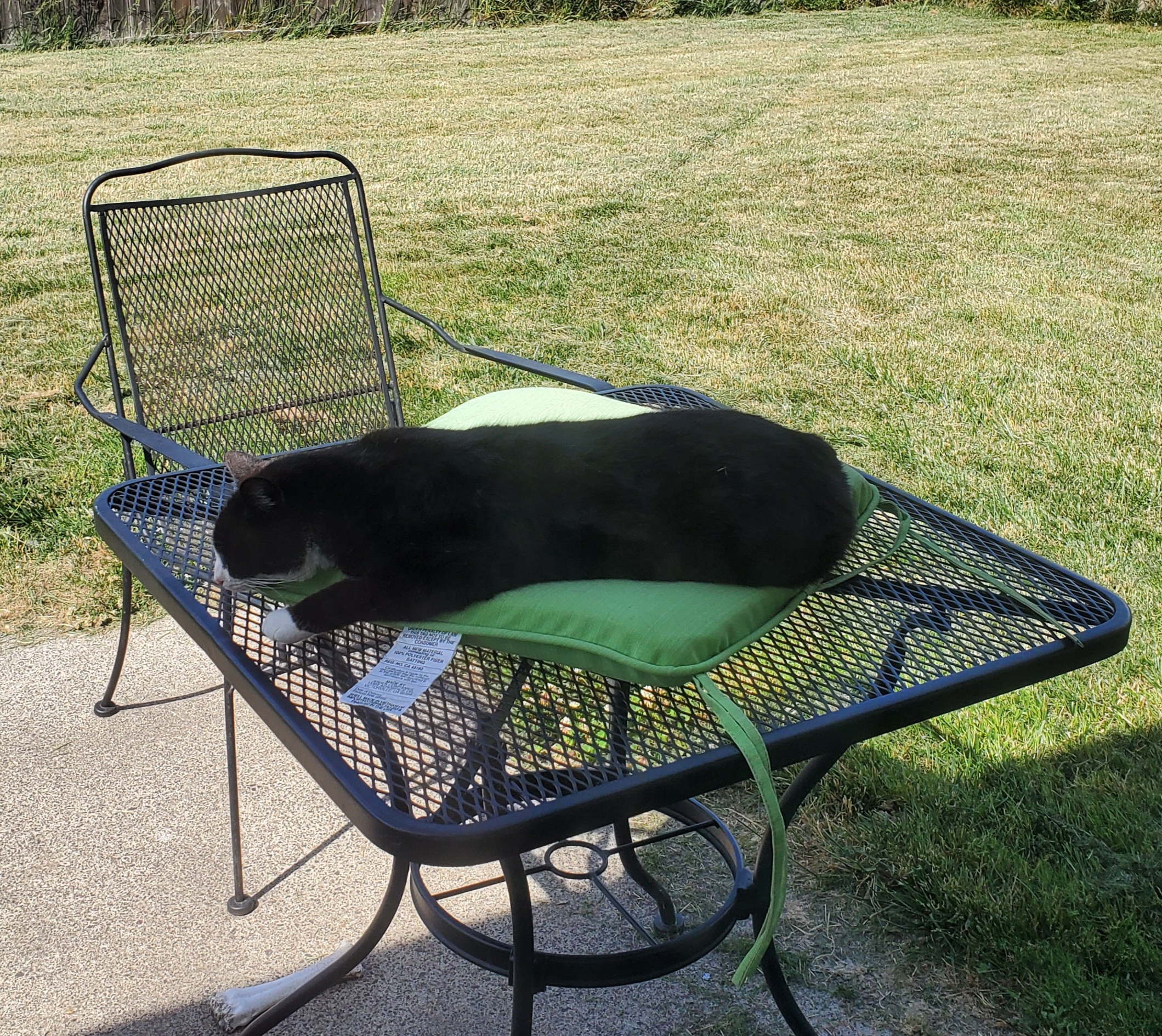 I went out back to mow, and the seat cushion for one of the deck chairs was on the ground. It’s going to rain tomorrow, so I put it on the table to take in when I was done mowing. I promptly forgot. Looking out later, I see that Theo is using it to take a cat nap.